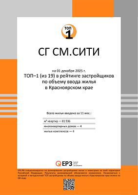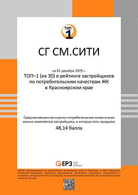 Кроме того, по данным ЕРЗ.РФ на 1 декабря 2025 года, СМ.СИТИ 4-ый год подряд удерживает лидерство в рейтинге застройщиков Красноярского края по потребительским качествам жилых комплексов. ЕРЗ оценивает проекты и присваивает им баллы по множеству критериев, включая архитектуру домов, благоустройство территории, парковочные пространства, дизайн общественных мест, качество материалов, планировочные решения квартир, озеленение дворов, наличие консьержа и другие. На их основе формируется итоговая оценка комплекса.